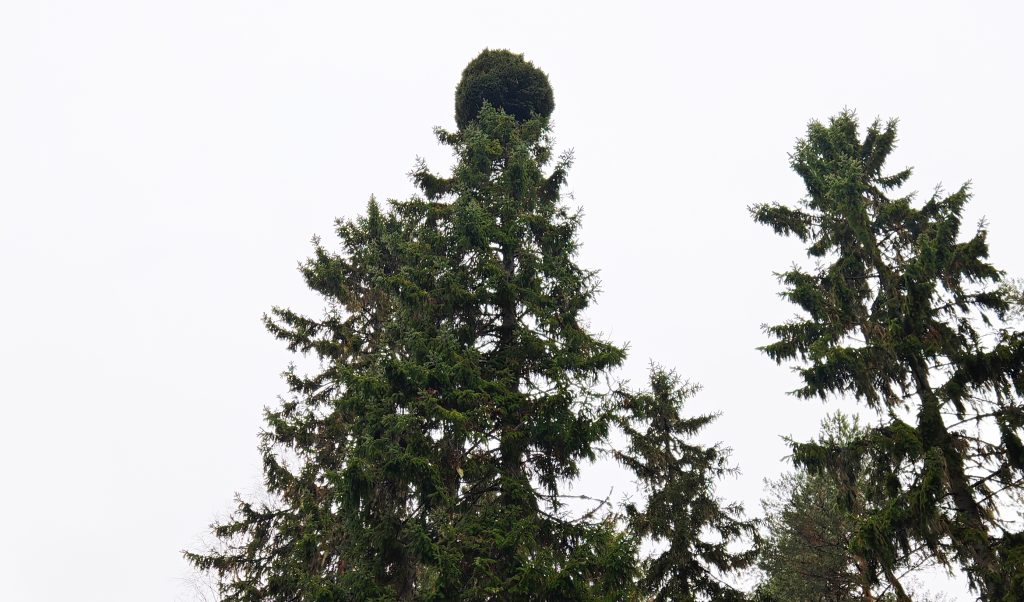 Leila Heinonen ikuisti Lamminaholla erikoisen kuusen, jonka latvassa on pallomainen muodostelma.