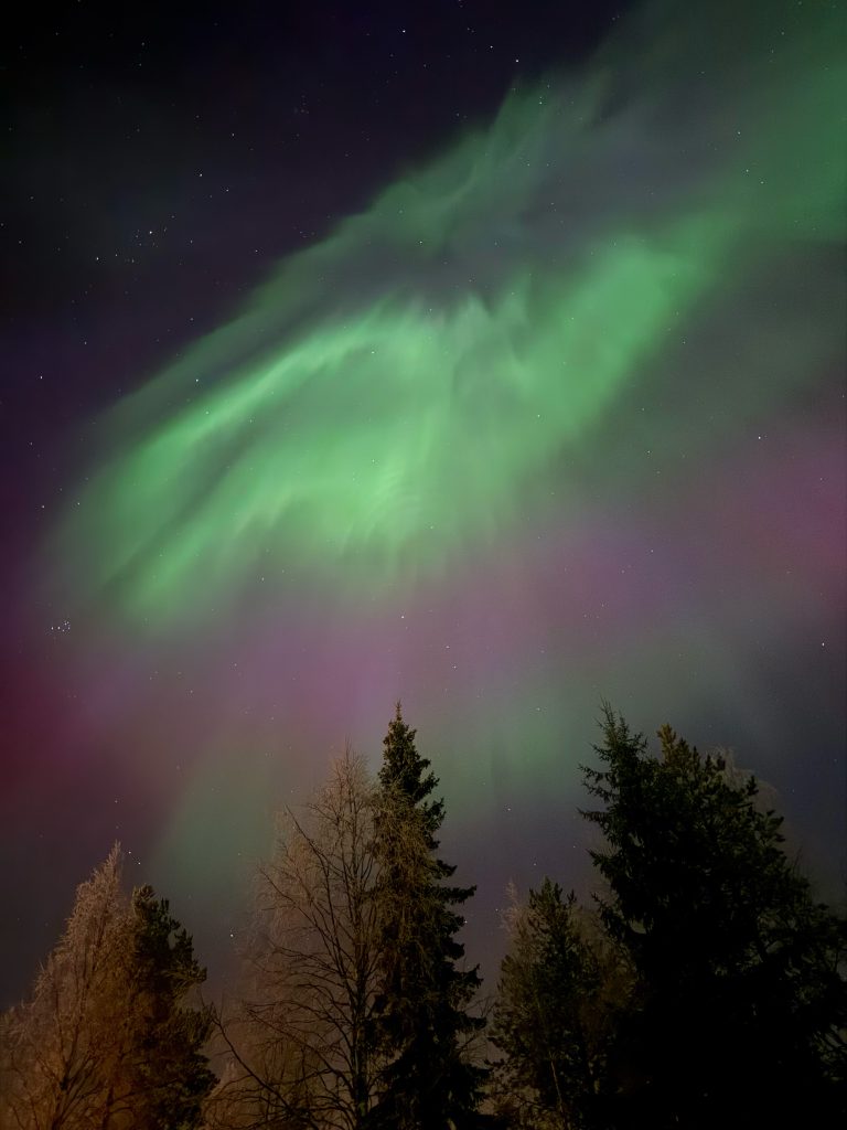 Viime viikkoina taivaalla on hehkunut revontulia monissa sävyissä. Tämän kuvan nappasi toimittajamme Sonja.
